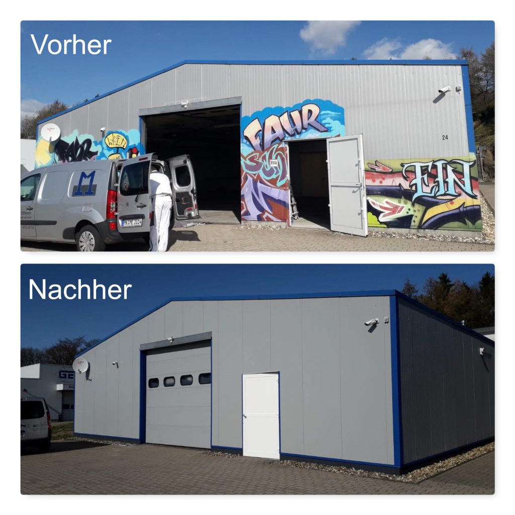 21.03.2019 / Halver. Bei strahlendem Sonnenschein hat der Malerfachbetrieb Elftmann die Fassadensaison eröffnet. Die Metallfassade, die mit Graffiti besprayt war hat durch gründliche Reinigung , Schleifen und Beschichtung mit Metallschutzfarbe eine völlig neue Optik verliehen bekommen.